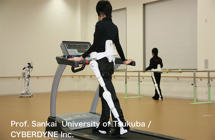 主には効率的な歩行をサポートするリハビリテーション機器です。歩行時の股関節の動きを感知しコンピューター制御で足の振りだしを支援するHondaアシスト、また、生体電位(足の筋肉を動かすための脳からの信号)を関知し、足の振りだしや踏ん張りを支援するロボットスーツHAL、様々な疾患や障がいのタイプにも応用できる優れものです。